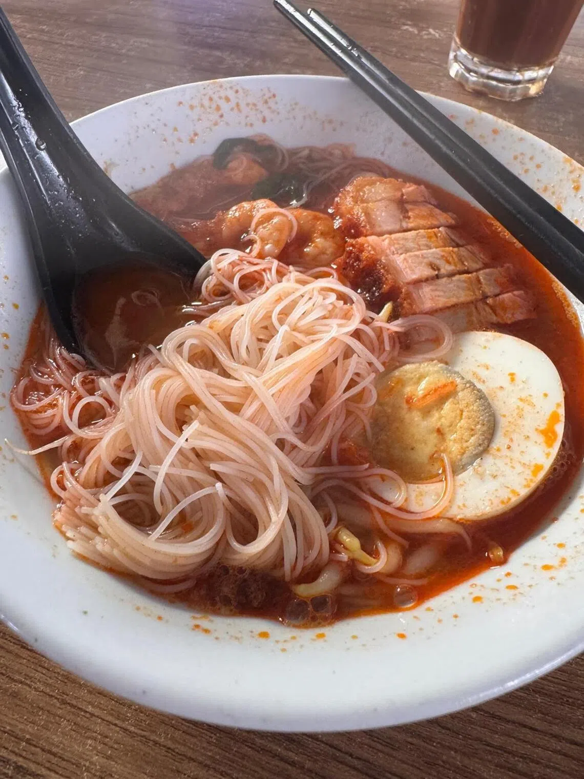 Пчелиный хун держит укус, не намокая. темно-красный бульон подается с кусочками свинины, сушеными креветками и луком-шалотом.