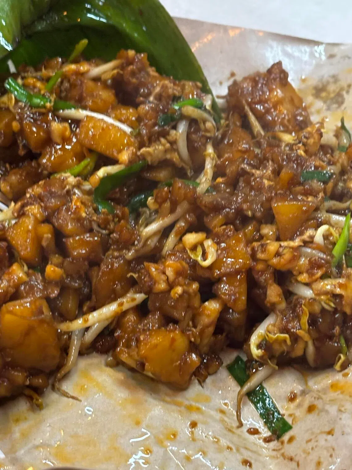 Возле кофейни разносчик на тележке готовит бурю, готовя то, что пенангийцы называют чар коай как (8,50 ринггитов), которое напоминает черный жареный морковный пирог. Он одновременно пикантный и сладкий, с липкой текстурой, контрастирующей с хрусткостью ростков фасоли.