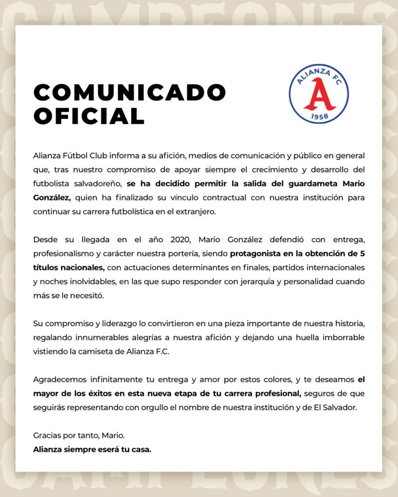 «Футбольный клуб «Альянса» информирует своих болельщиков, средства массовой информации и широкую общественность о том, что после нашего обязательства всегда поддерживать рост и развитие сальвадорского футболиста было решено разрешить уход вратаря Марио Гонсалеса, который разорвал свои контрактные отношения с нашим учреждением, чтобы продолжить свою футбольную карьеру за границей», — подробно описано в сообщении, опубликованном в социальных сетях.