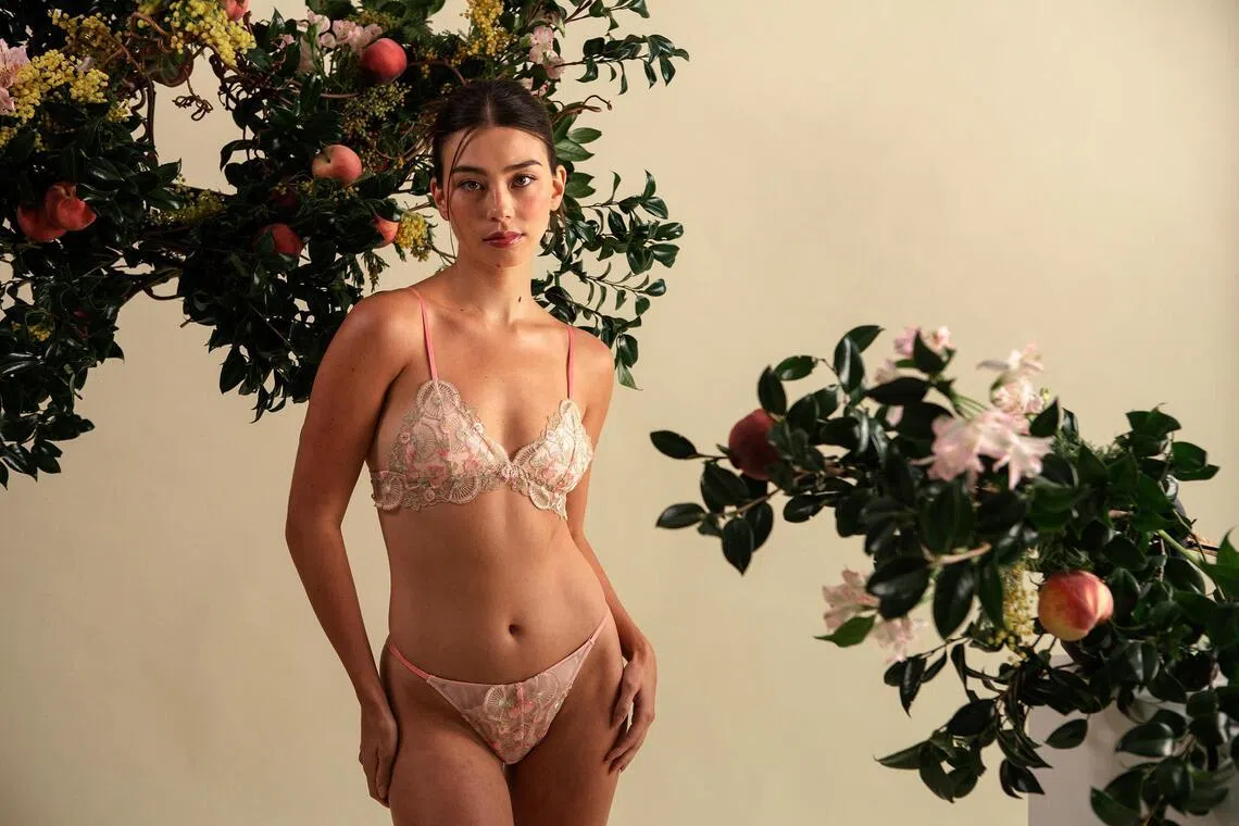 Принт доступен в двух цветовых решениях — «Розовые персики» и «Винные персики» — можно найти на бюстгалтере без косточек Mia Lucky Girl (69 долларов), укороченном топе с подкладкой (89 долларов) и Cheeky (39 долларов).
