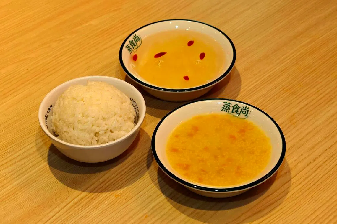 В каждый набор входит многоразовый мелкозернистый рис, тыквенная каша с пшеном и тыквой или слегка подслащенный десерт из снежных грибов. При заказе по меню эти товары стоят 1 доллар США за штуку и могут быть пополнены без дополнительной оплаты.