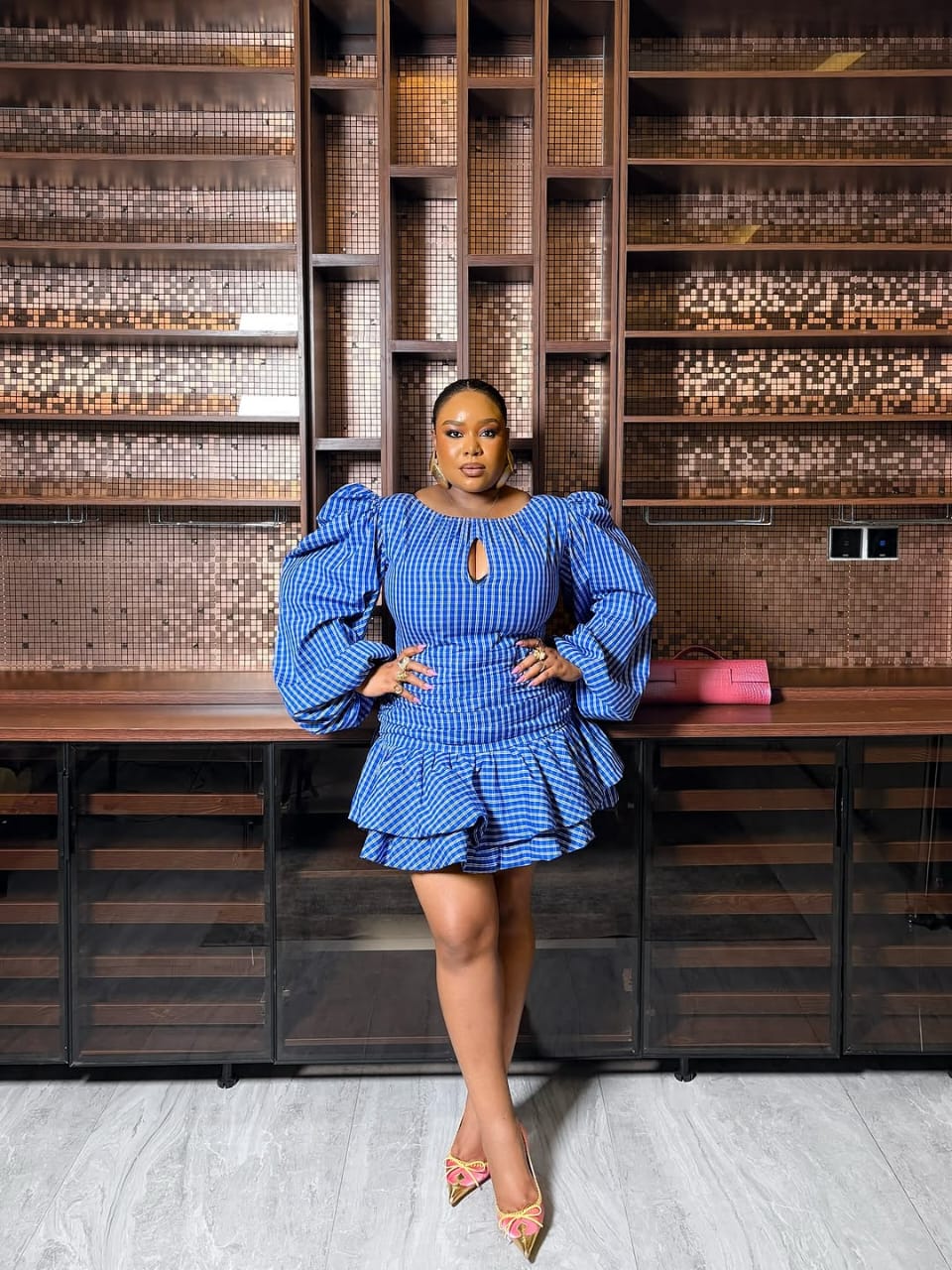 Классическое с кокетливым оттенком мини-платье в клетку синего цвета излучает вечное очарование. Пышные рукава и оборчатый подол придают образу причудливости, а вырез-капля добавляет очарования. Это платье прекрасно подойдет для непринужденных свиданий — например, уютных ужинов в бистро или вечеров кино. Завершите образ яркими туфлями и яркой губой, чтобы создать игривый контраст с мягкими голубыми тонами.