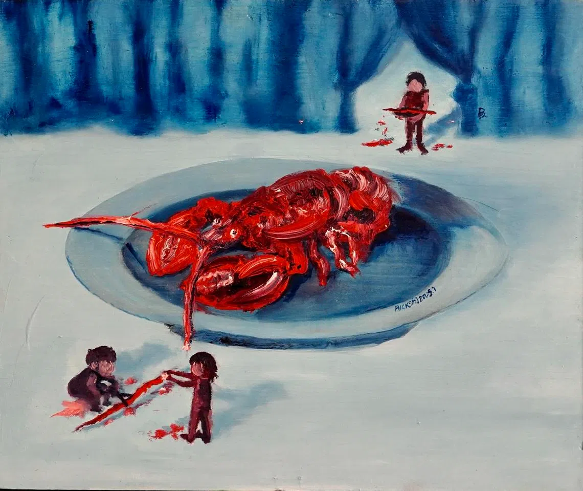 В работе Рика Ши дерзкие лобстеры противостоят кровавым пещерным людям.