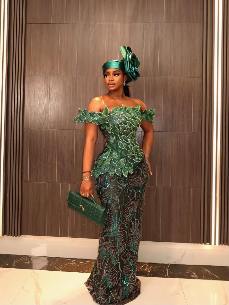 Присцилла Оджо был настоящей королевской особой овамбе на свадьбе 606 Autos в пышном изумрудном шедевре Ласосы. Силуэт с открытыми плечами, украшенный аппликацией в виде листьев, красиво обрамлял ее декольте, а расшитая пайетками юбка добавляла фирменный озерный блеск. В сочетании с блестящим желтый и текстурированный клатч излучали современную элегантность и тихую роскошь.