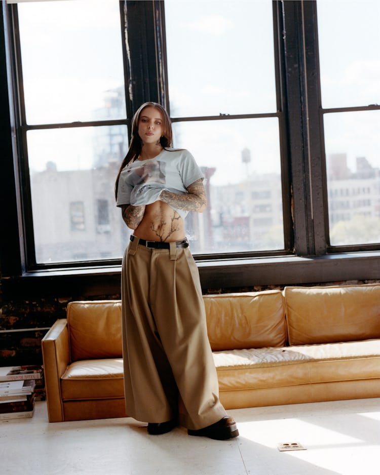 Верхнее изображение предоставлено: топ-кроссовки, брюки Willy Chavarria, собственные украшения Talent.