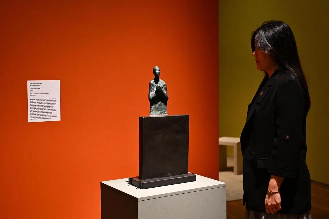 Например, скромная скульптура Долорозы, изображающая связанную женщину с кляпом во рту, давшая название выставке, — это работа 2003 года, отдающая дань уважения женщины политические заключенные, содержащиеся под стражей без суда в рамках режима «Нового порядка» в Индонезии.