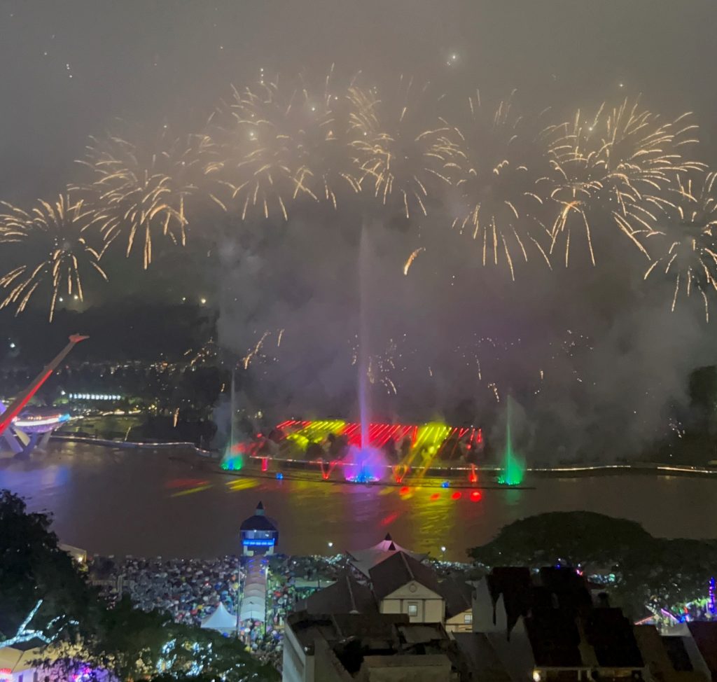 Кульминацией вечера стал впечатляющий фейерверк в полночь. В начале обратного отсчета на светодиодных дисплеях были показаны девизы Саравака, такие как «Саравак Маджу Макмур» и «Сегулай Седжалай».
